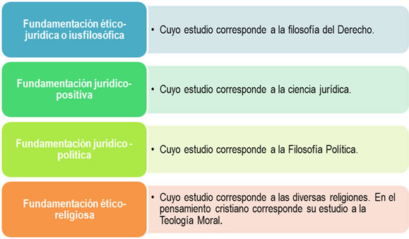 Como ya se ha visto con anterioridad los Derechos Humanos son una realidad compleja de naturaleza ético- jurídica y política, según el ámbito al que se refiere la fundamentación de los Derechos Humanos puede hablarse de diversos tipos o clases de fundamentación, los cuales se presentan en el siguiente esquema: